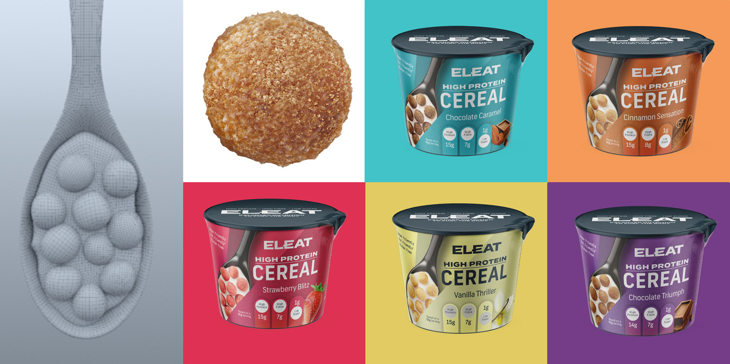 We used 3D modeling and rendering techniques to create a beautiful and powerful visual appeal for the high-protein Eleat cereal.